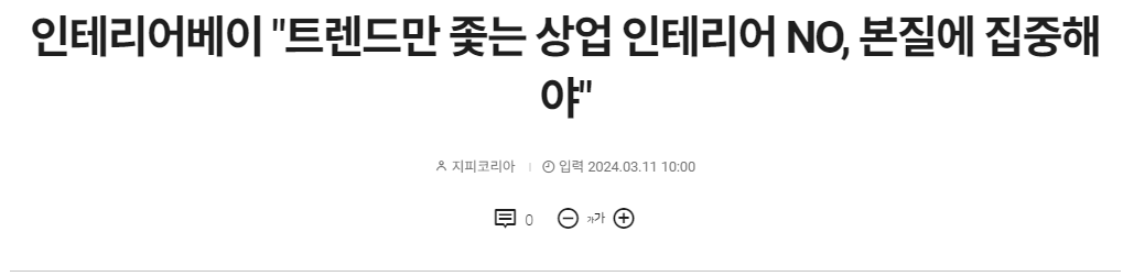 이와 관련해 상업 인테리어 전문 ‘인테리어베이’ 관계자는 “인테리어 트렌드는 옷이나 뷰티 등의 분야보다는 변화 속도가 느리지만, 매년 빠르게 변화하는 것은 마찬가지”라며 “이에 급변하는 트렌드를 좇아가는 데 급급한 인테리어보다는 매장의 가치를 드러내고 경쟁력을 확보할 수 있는 상업 인테리어 본질에 집중하는 것이 중요하다”고 조언했다.
