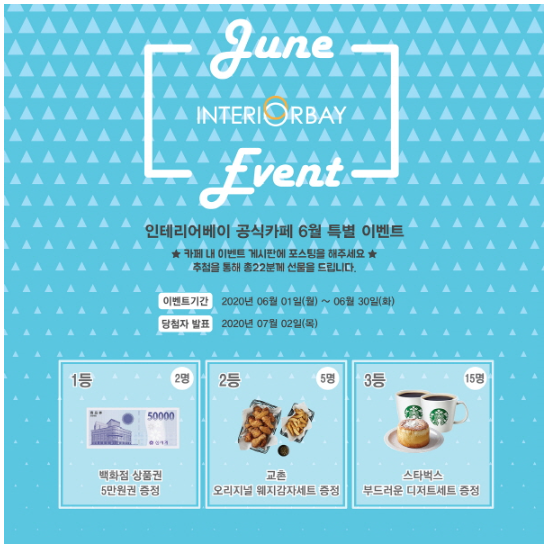 정성을 들인 포스팅 및 좋아요 또는 댓글, 조회수가 많은 게시글일수록 당첨 확률이 높아지며, 당첨자는 이벤트 마감 후 7월 2일에 인테리어베이 공식카페를 통해 발표한다.